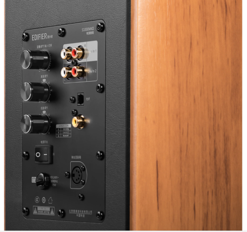 Edifier S1000MKIIHi-Res Audio Active 2.0 Bluetooth Bookshelf Speaker Set - Brown. Aluminium bass speaker for surge and wave bass, pure sound with advanced titanium dome tweeter. Designed with classic wooden side panels, the S1000 MKII is angled to ensure front-facing drivers positioned for optimum performance without compromise.